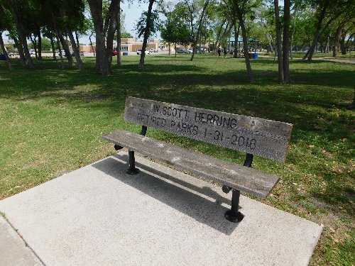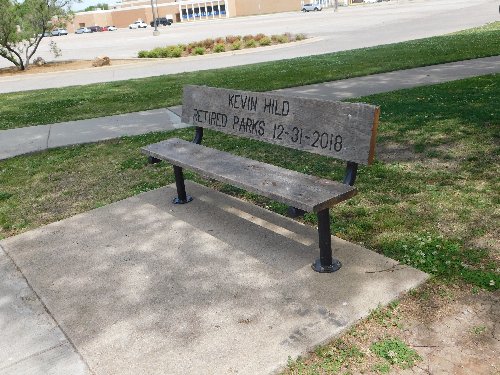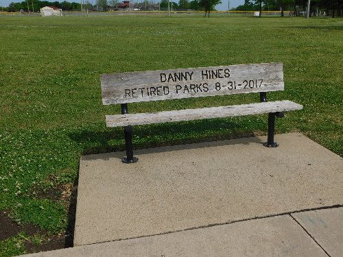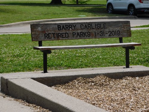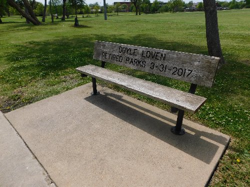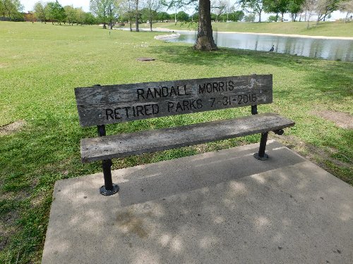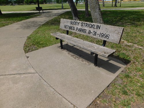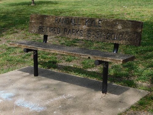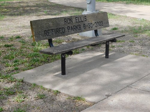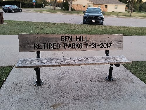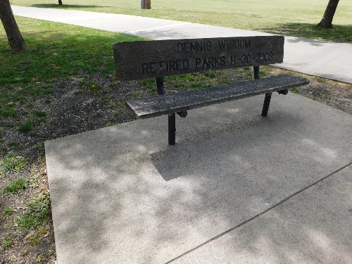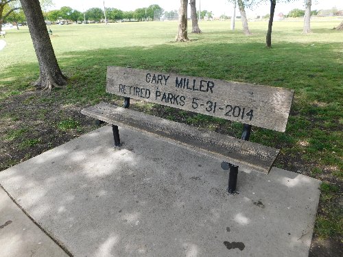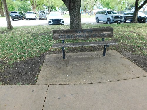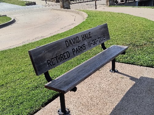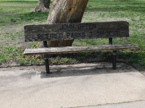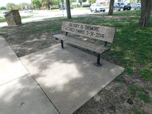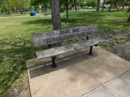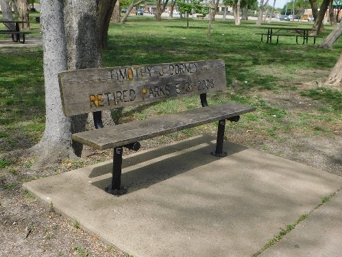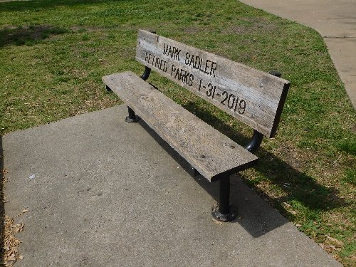 Most of the benches are made of wooden planks attached to metal frames. Only three benches are made entirely of metal. All but two of the wooden benches have the name of a former Park Department employee carved into them, in large letters, with date of retirement.