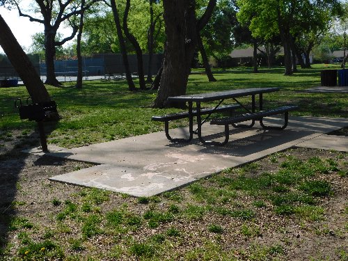 Here's another picnic pad with a table and grill, but no trash cans. |